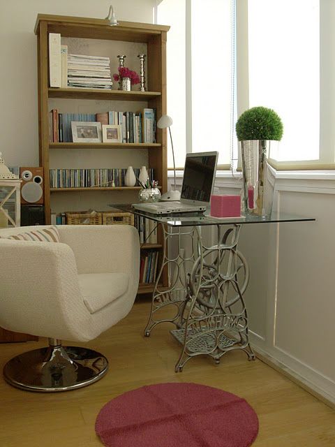 Os móveis nem sempre precisam ser usados na sua função original, aqui nós temos a base de uma antiga máquina de costura usada como o pé da mesa de trabalho. Esse tipo de intervenção deixa qualquer casa com mais estil, e o melhor é que você pode aproveitar coisas antigas que você já tem em casa e não usa.